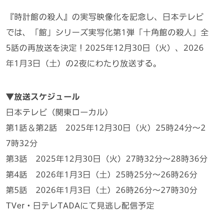 さらに『#十角館の殺人』の再放送が、日本テレビのみであります🥰